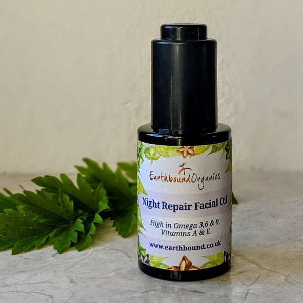 Night Repair Facial Oil is made with cold pressed organic oils high in omegas 3,6 and 9 and Vitamins A & E to repair and promote new cell growth, rejuvenating the skin and reducing fine lines while you sleep. Find the full product description here.